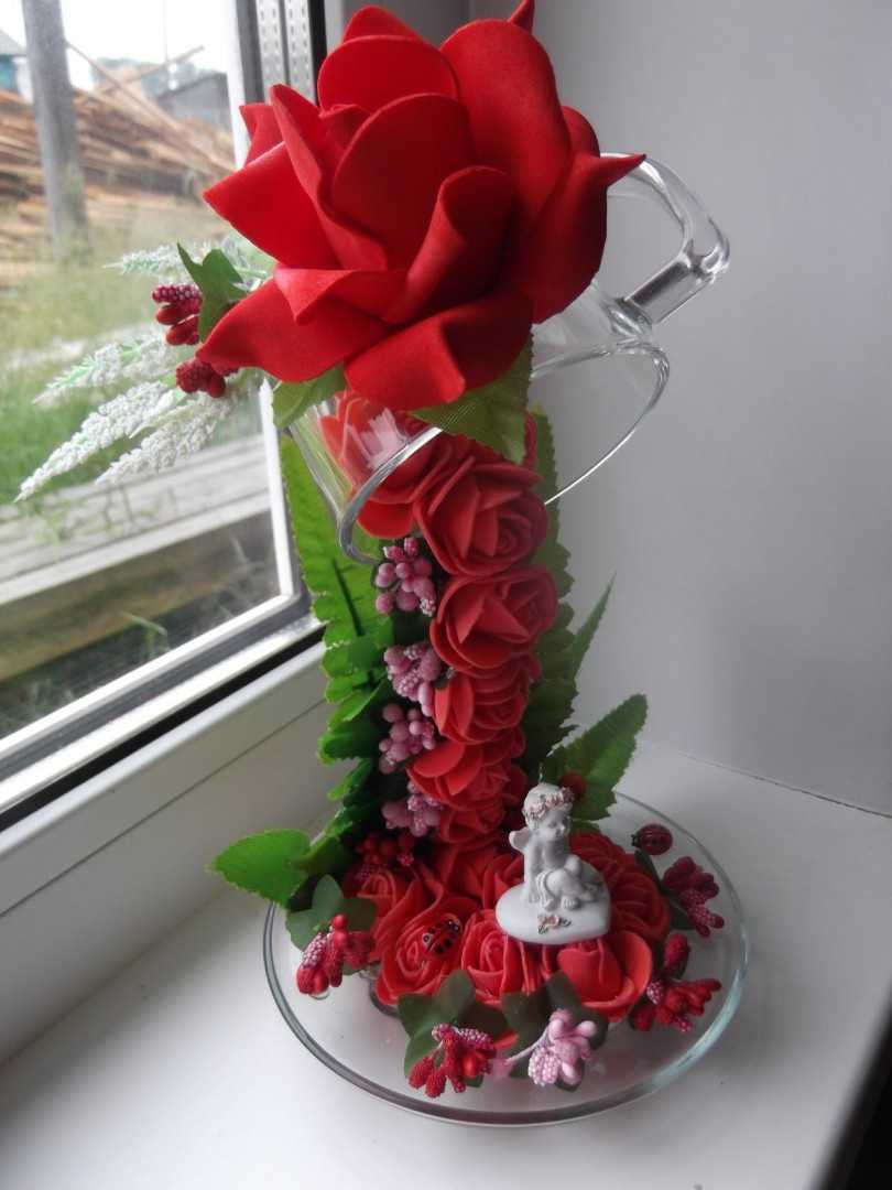 - Украшаете чашку по своему вкусу, приклеивая цветы и аксессуары в произвольном порядке.