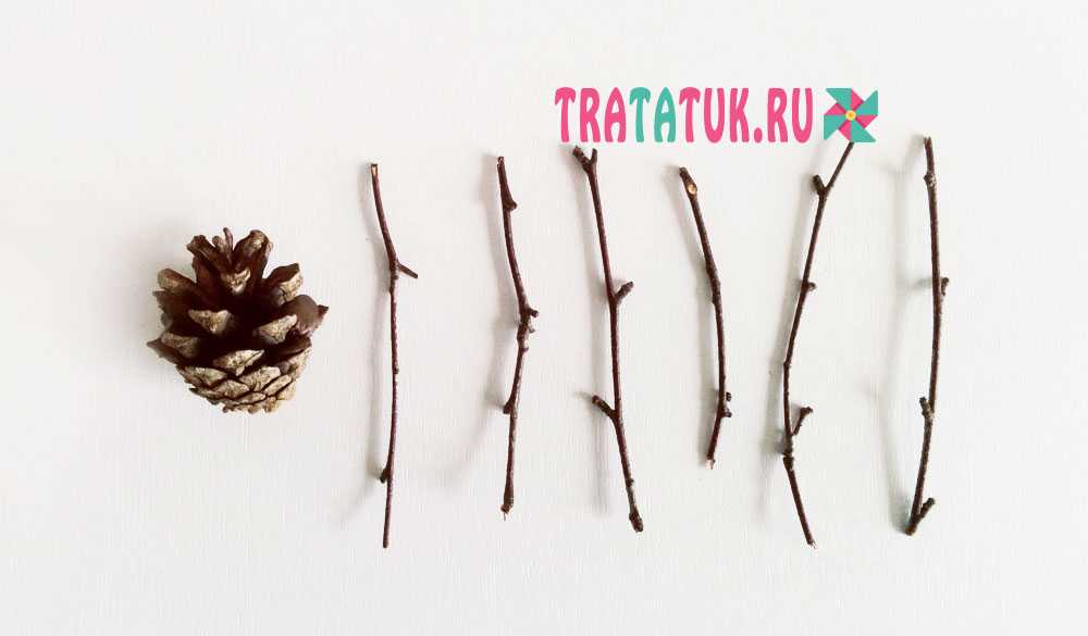 Приготовьте 6 одинаковых частей, отломанных от ветки. На шишку между чешуйками приклейте коричневый пластилин.