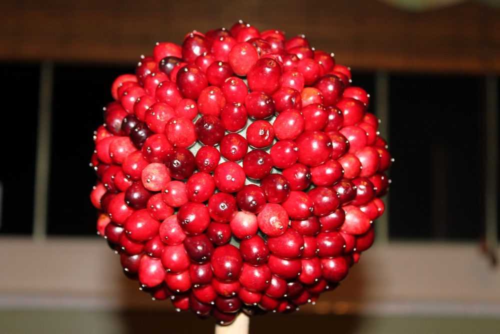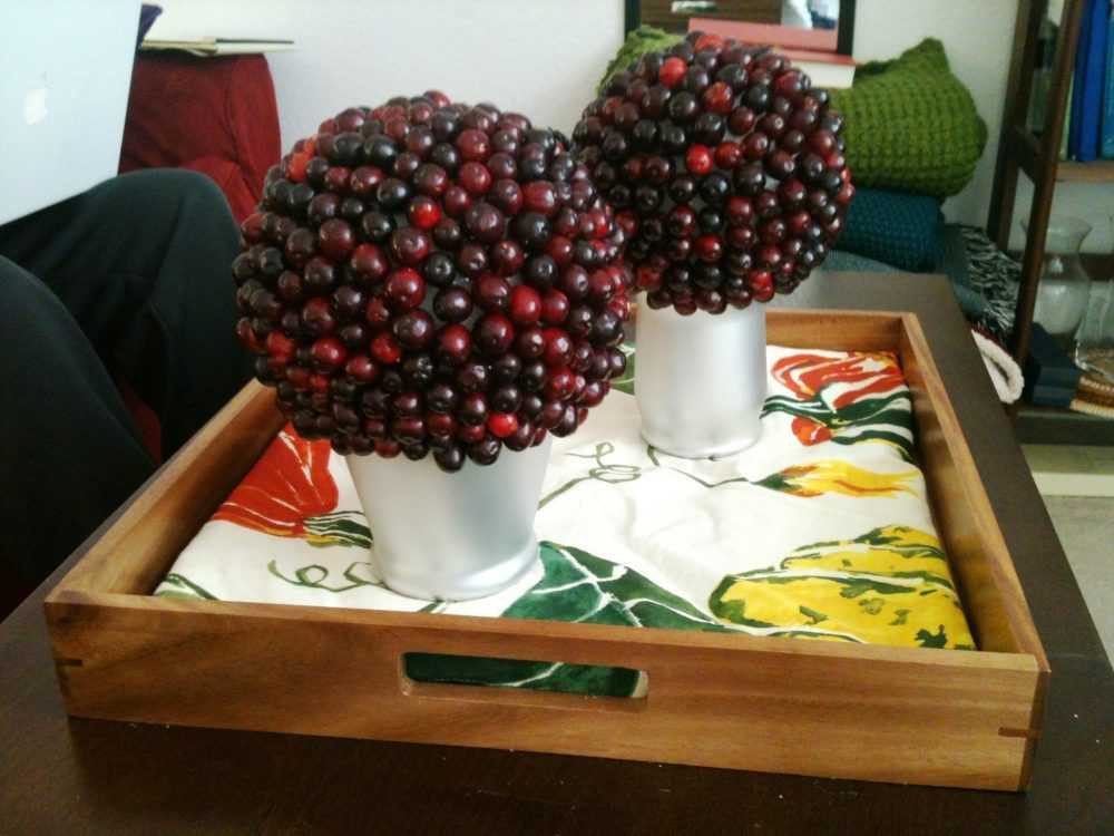 Чтобы завершить изготовление такой поделки из фруктов своими руками, с помощью бамбуковой палочки прикрепляют к телу голову и всю конструкцию устанавливают на постамент. Вокруг «гусеницы» беспорядочно разбрасывают оставшиеся ягодки черешни.