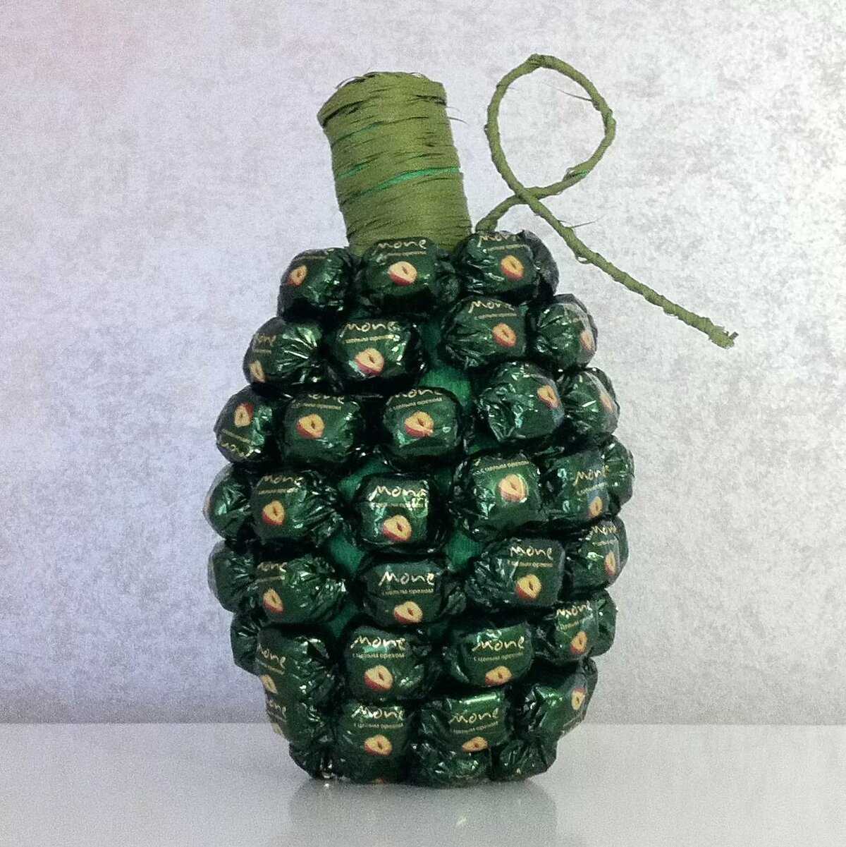 Не менее интересно чем пушка смотрится танк из бутылки. Если вам нужен еще один сладкий подарок для парня, сделайте пивную кружку из конфет.