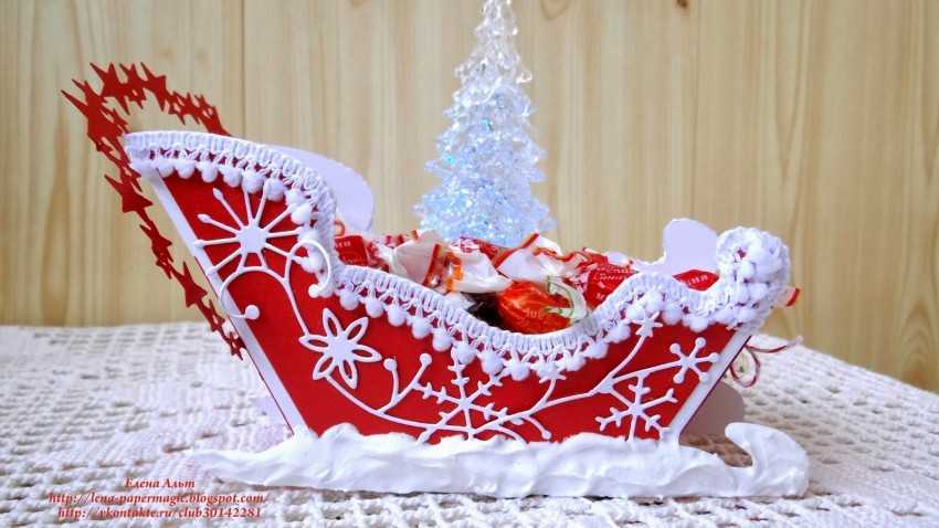 Используя простой шаблон для саней своими руками, из плотного картона можно сделать поделку, используемую в качества подставки для сладостей.