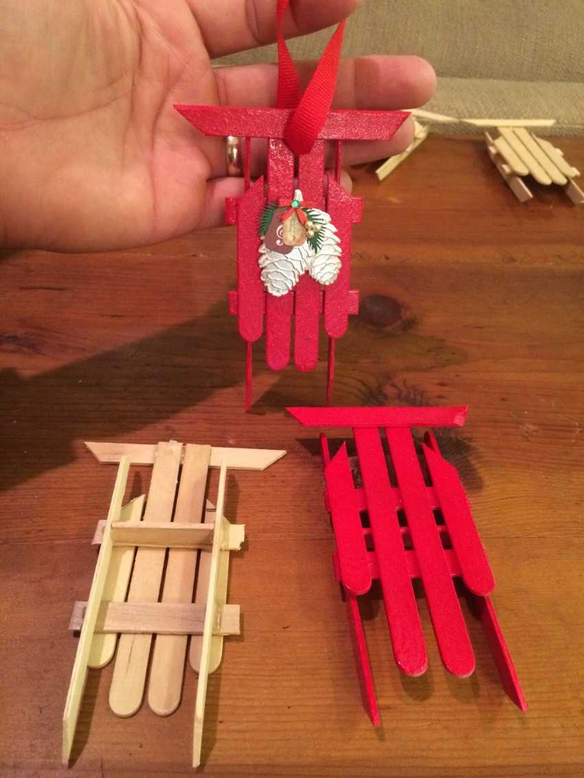 - после крепления каркаса к задней части саней, к их основе приклеиваются две палочки от мороженного;