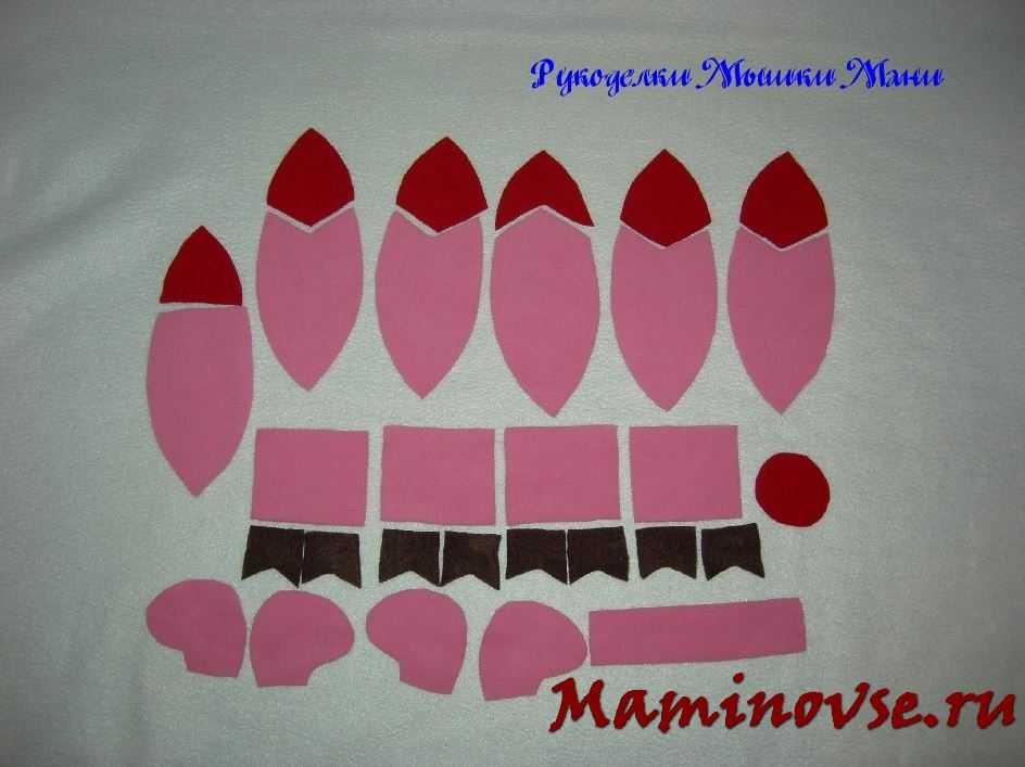 Конечно же, здесь не обойтись без романтичной Нюши. Вырезаем ее из розового картона, на который нужно нанести некоторые детали красной краской.