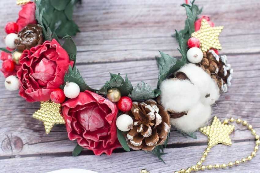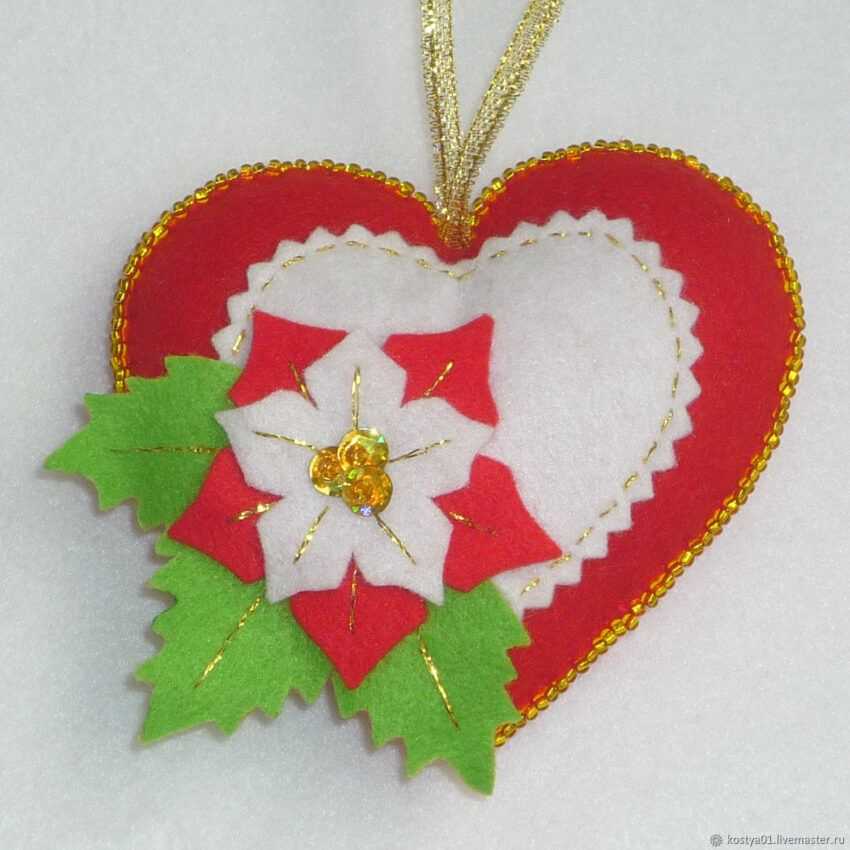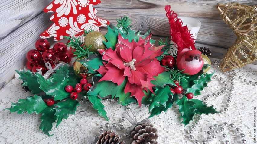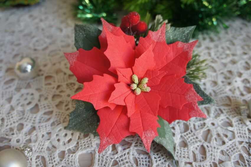 Пуансеттия. Этот цветок также называют рождественской звездой. Для ее изготовления понадобится вырезать заготовки: красные лепестки и зеленые листочки. На каждой детали рисуют зубочисткой прожилки, обрабатывают утюгом для придания формы. Тычинки можно сделать из проволоки и бисера. Готовые цветы станут отличным дополнением к другим поделкам из фоамирана на новогоднюю тематику, например, венкам, подсвечникам.