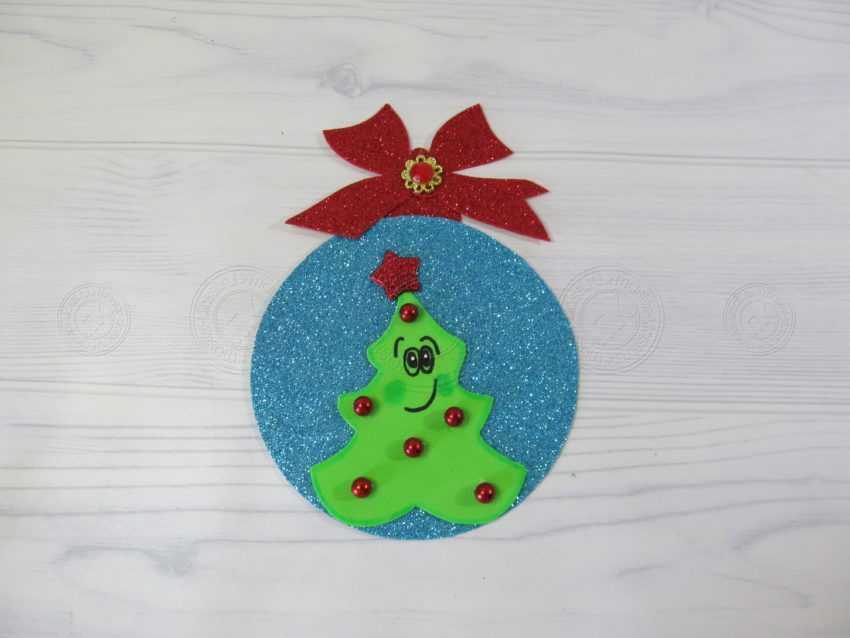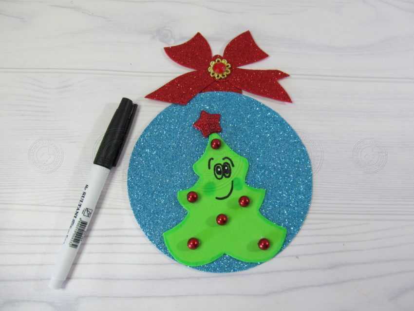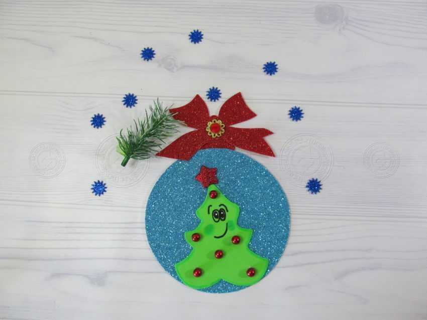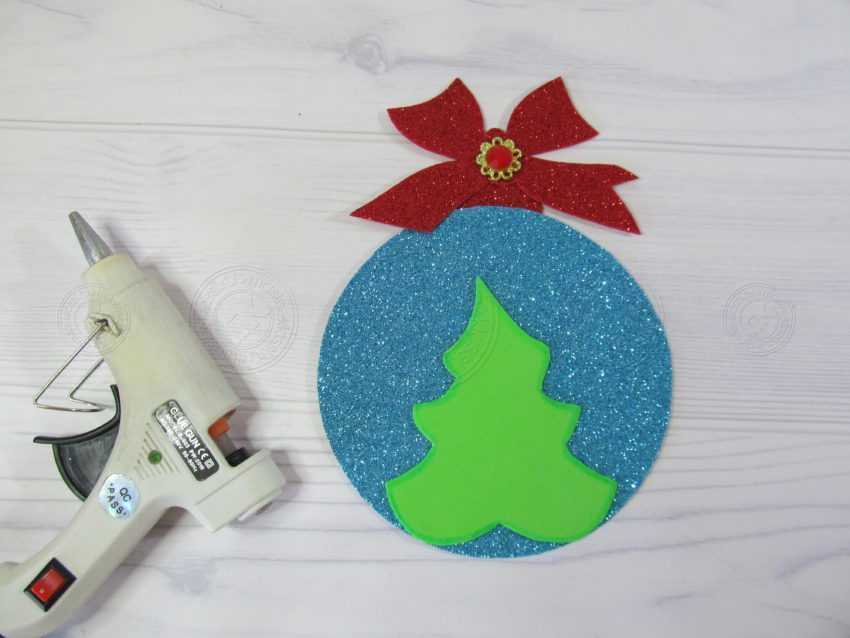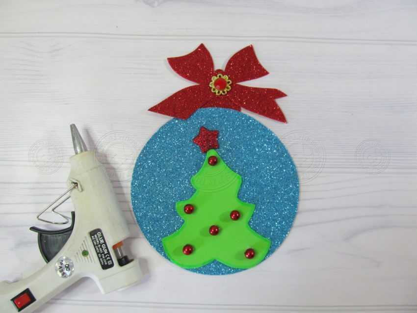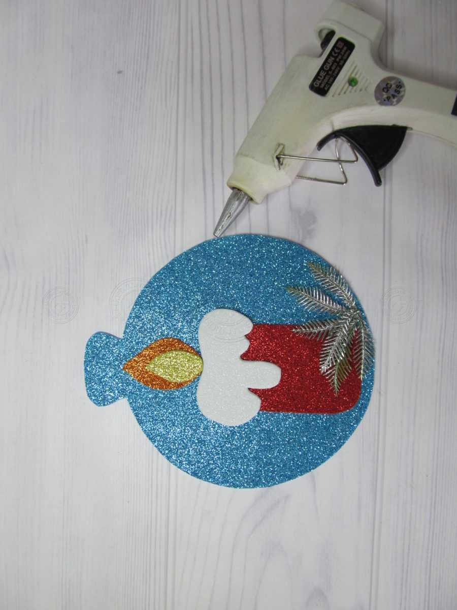 Затем приклеиваем и сам бокал. Но чтобы со всем было по новогоднему мы сделаем сосновые веточки из фоамирана и приклеим на диск вокруг бокала. Вот такая замечательная новогодняя поделка из фоамирана у нас получилась.