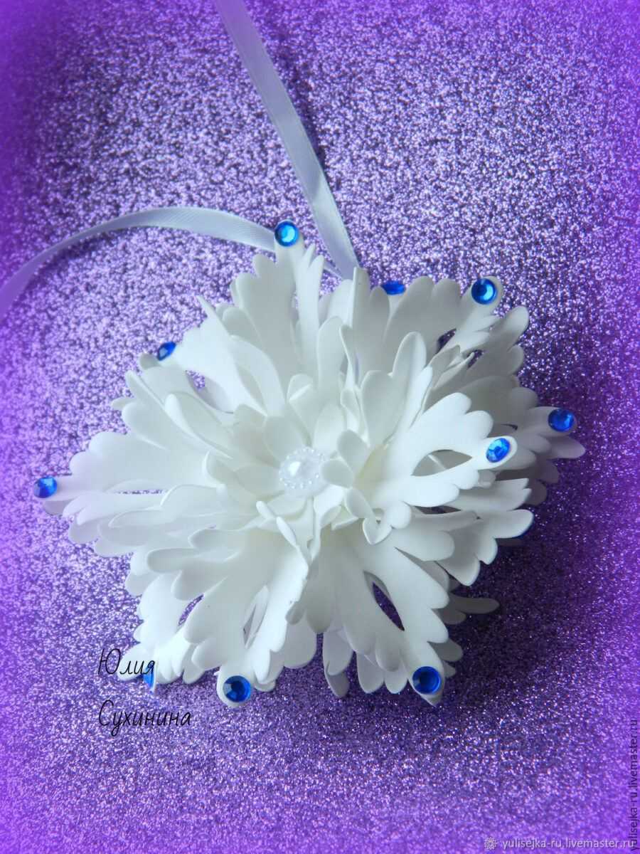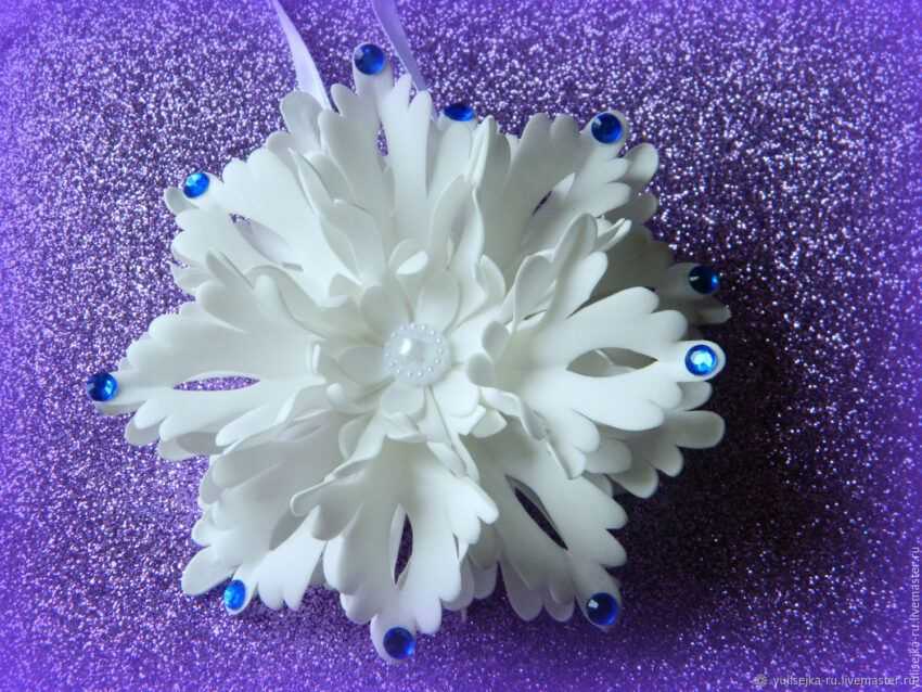 Снежинки. Они могут отличаться формой, размером, цветом, их можно декорировать бусинами, жемчужинами. Снежинки можно использовать в качестве елочных игрушек, а можно украсить ими заколку, ободок, резинку для волос.