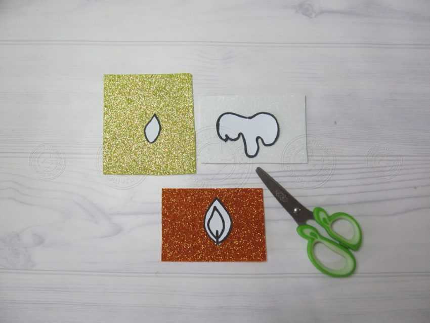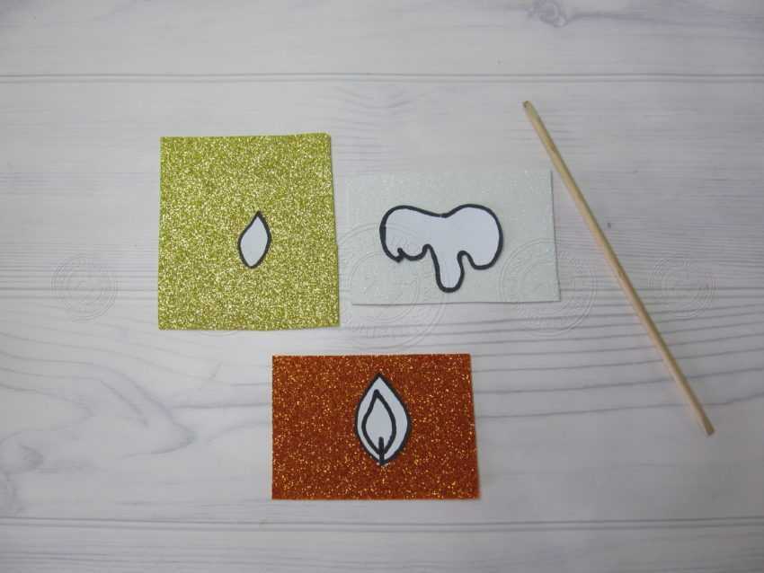 13. У вас должен остаться шаблон свечи из обычной бумаги. У него нам необходимо забрать верхушку и поместить на белый лист, после чего разместив на оранжевом слое пламя, обведите обе детали. Когда все будет готово, вырежьте внутреннюю часть огня и положите его на желтый фоамиран и поступите аналогично, пройдясь по кругу деревянной палочкой.