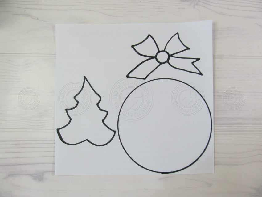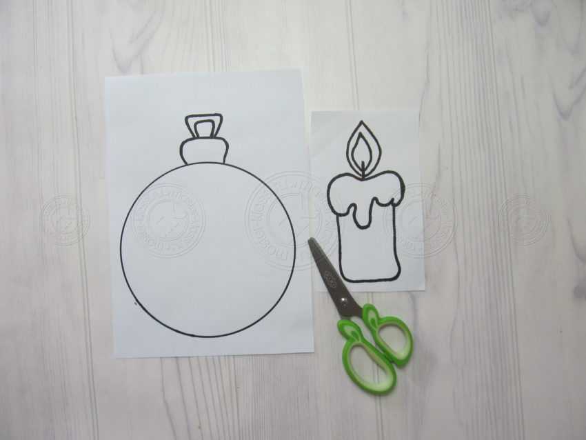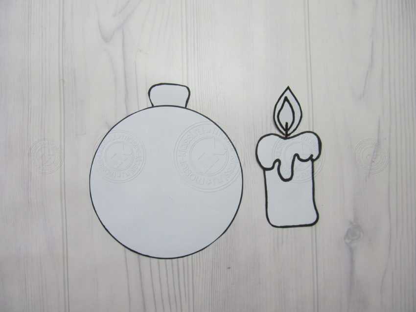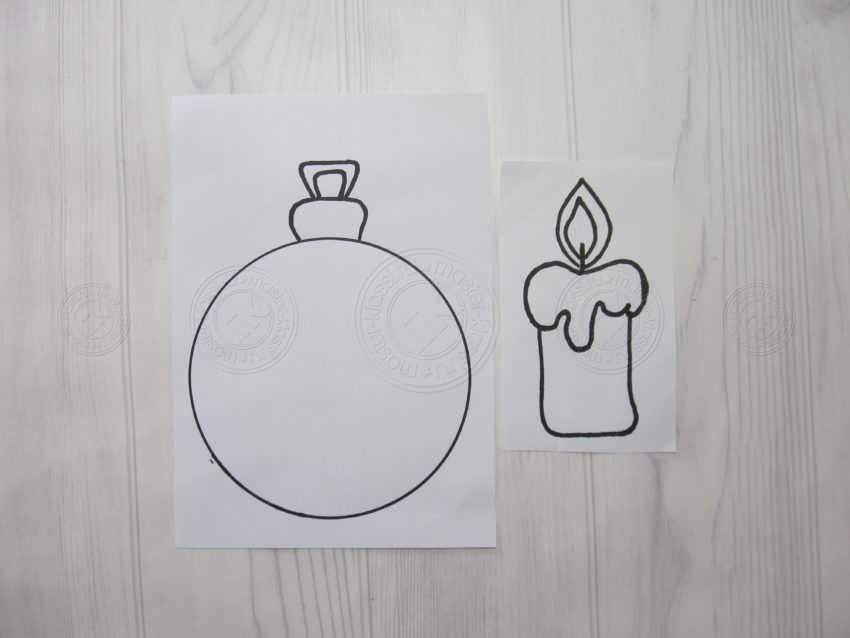 1. Подготовьте шаблон, согласно тому, что вы видите на фотографии. Необходимо взять два листа и на одном нарисовать фломастером елочную игрушку, а на другом горящую свечу. После того, как все будет готово двигайтесь дальше.