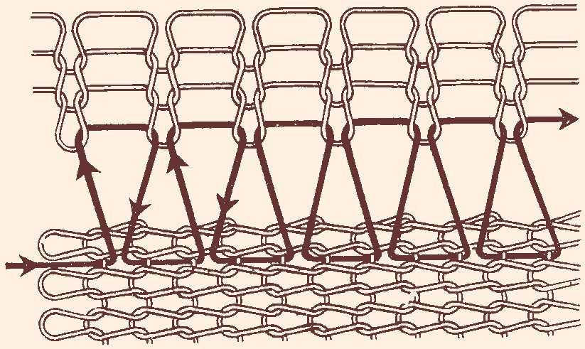 Горизонтальный трикотажный шов используется для соединения деталей чулочного вязания за открытые петли. Чтобы сшиваемые детали лежали свободно и не распускались, на них провязывают несколько рядов (4-10) дополнительной нитью, приутюживают край детали через влажную ткань и перед выполнением шва ряды из дополнительной нити распускают. Открытые петли обеих деталей располагают друг против друга и сшивают их справа налево по лицевой стороне нитью того же цвета и толщины, которой вязали детали. Для этого иглу вводят снизу вверх с изнаночной стороны на лицевую в 1-ю петлю нижнего ряда. Затем — сверху вниз с лицевой стороны на изнаночную в 1-ю петлю верхнего ряда и сразу же выводят ее снизу вверх в рядом стоящую 2-ю петлю верхнего ряда. Вводят иглу сверху вниз с лицевой стороны на изнаночную в 1-ю петлю нижнего ряда и сразу же выводят ее снизу вверх в рядом стоящую 2-ю петлю нижнего ряда. Затем — сверху вниз во 2-ю петлю верхнего ряда, а выводят снизу вверх в рядом стоящую 3-ю петлю и т.д. Петли шва должны быть такого же размера, как петли полотна. Только при этом условии шов будет абсолютно незаметен.