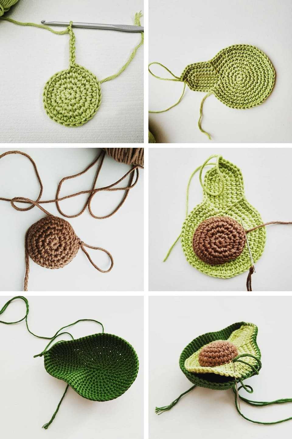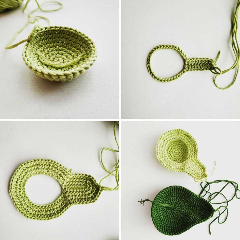 Снова убавляем по 1 петле, обратно – без изменений. Последний ряд – заканчиваем основание груши плавненько, убавив еще пару петелек. Получаем заготовку и обвязываем ее зеленой нитью следующим образом: верхушку обвязываем столбиками без накида, толстенькую «попку» груши обвяжем столбиками с накидом.