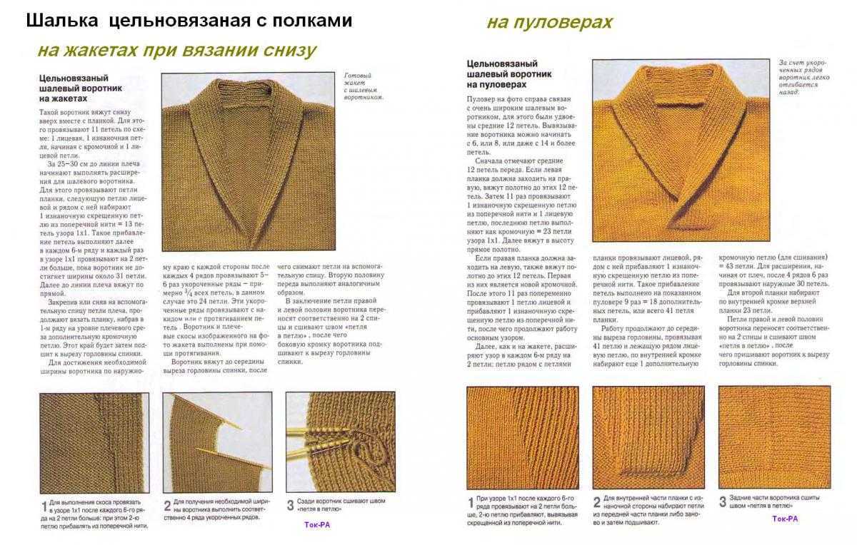 образуется непосредственно переходом вязания полотна на вязание горловины спицами с сохранением основного узора. Часто применяется в исполнении арановых узоров, крупной резинки. Этим же способом можно вывязать воротник-гольф или хомут.