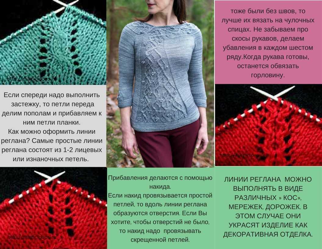 При изготовлении реглана путём вязания от горловины начинающей швее не понадобится тратить нервы и силы на сшивание отдельных частей. Именно эта часть процесса является одной из самых сложных. Плюс ко всему, данный способ позволяет легко регулировать длину изделия и корректировать весь облик вещи, так как количество ниток здесь невелико – реглан легко распустить в случае ошибки, а после начать с того места, которое хочется поменять.