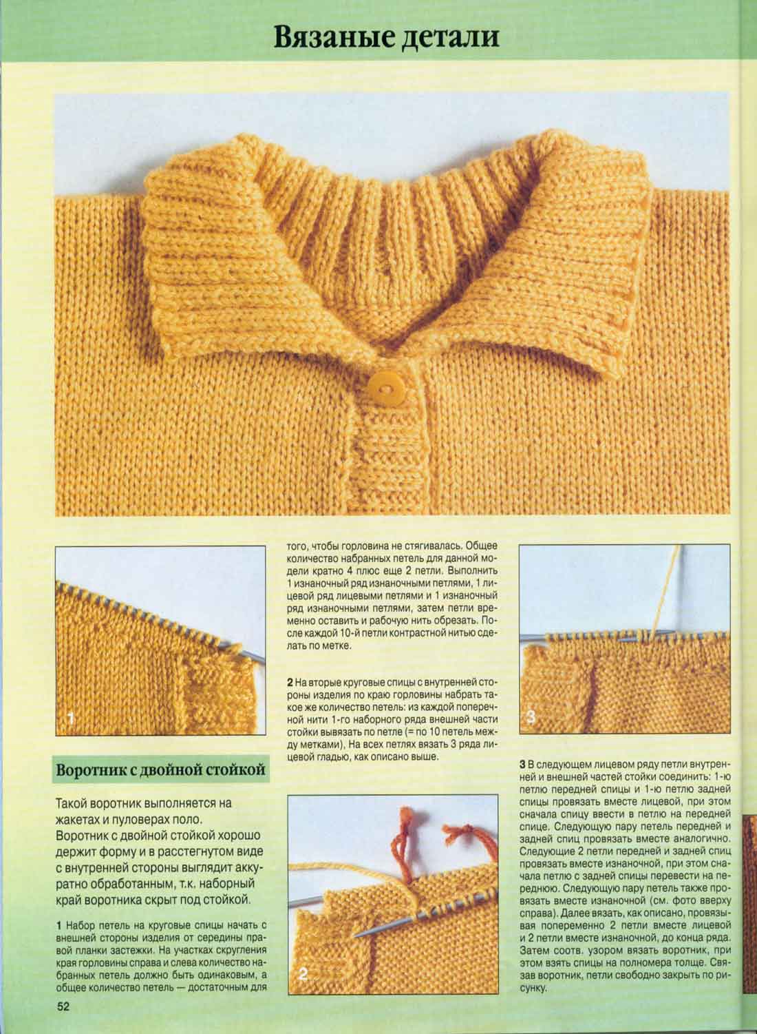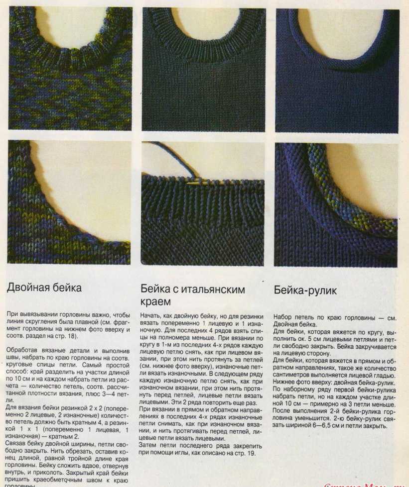 Познакомиться с классическими вариантами оформления выреза можно по фото готовых изделий. Простой бейкой отделывают детские и взрослые джемпера с круглым воротом. Чтобы у обвязки не было стыковочного шва, используют круговые спицы.