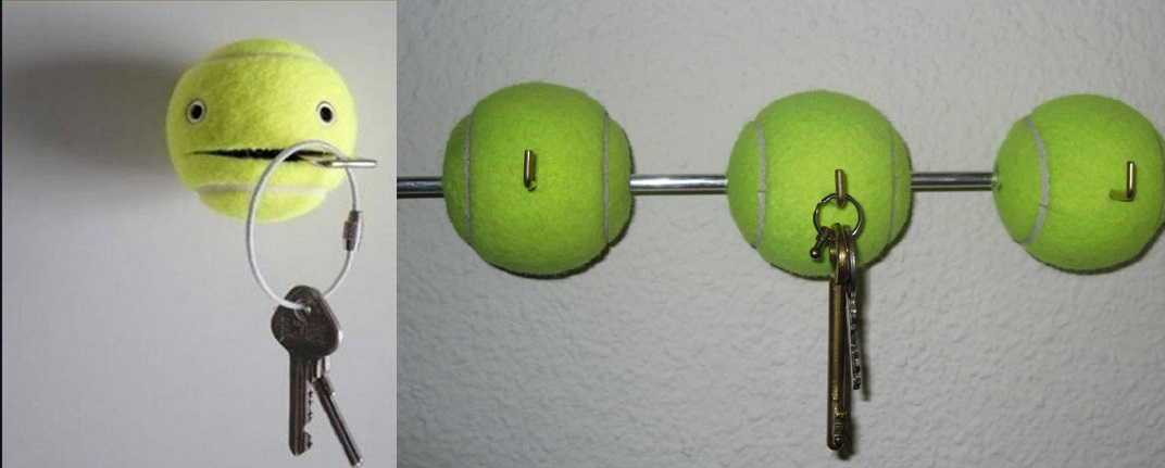 Если теннисный мячик надрезать примерно наполовину, он будет отлично держать мелкие предметы. Из нескольких таких «держателей» можно сделать ключницу в спортивном доме. Второй вариант на картинке справа. Если вы сумеете закрепить мячи на стержне (при помощи клея, например), вставить небольшие крючки не проблема. Проблема в том, что они, скорее всего, будут крутиться. А чтобы этого не происходило, внутрь мячика можно залить состав, который после высыхания/полимеризации станет жестким. Первое что приходит в голову — это плиточный клей. Вот только заливать его надо аккуратно. Если попадет на поверхность мяча и затвердеет, то уже не отмоете.