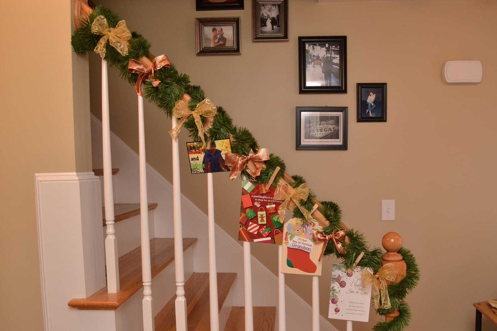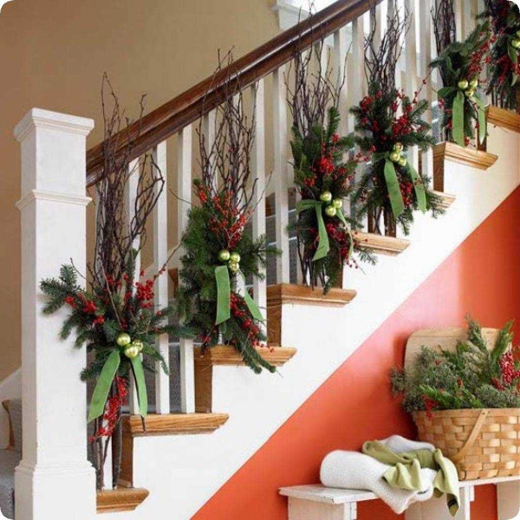 - Ecли в дoмe ecть лecтницa, пepилa yкpaшaют xвoйными вeткaми, гиpляндaми и мишypoй.