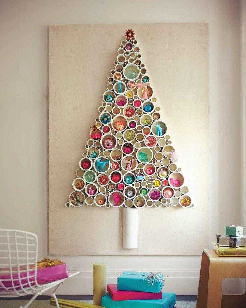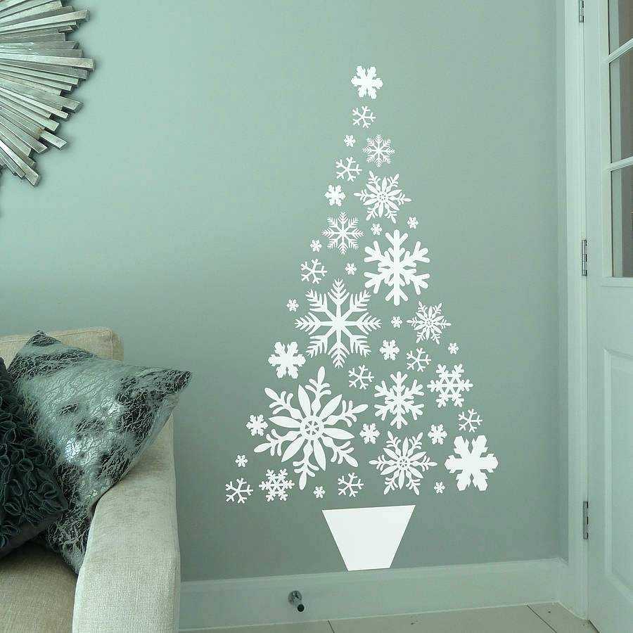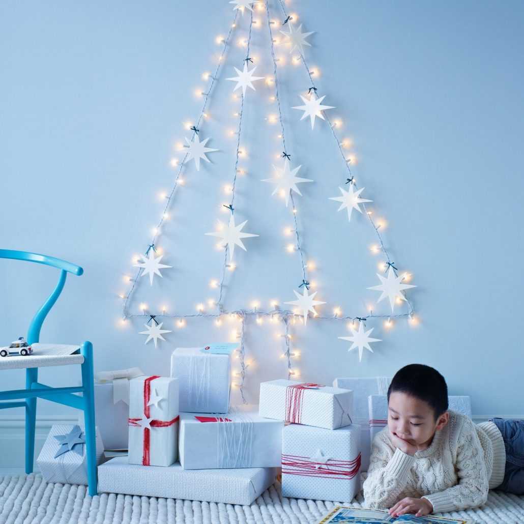 Многие современные квартиры не всегда позволяют разместить в них живое дерево. В таком случае на помощь приходят альтернативные варианты. Как вариант – модно сделать панно на стене. Для этого подойду самые разные материалы: гирлянды, декоративные наклейки, елочные игрушки и другие украшения.