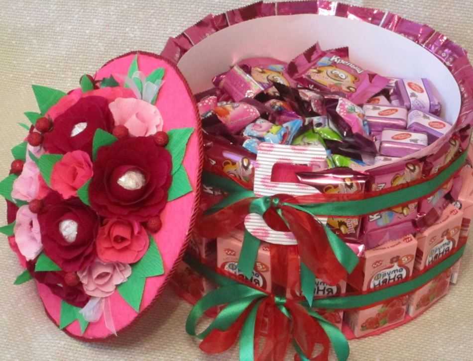 - Когда поделка высохнет, заполняем её конфетами, накрываем крышкой и дарим.