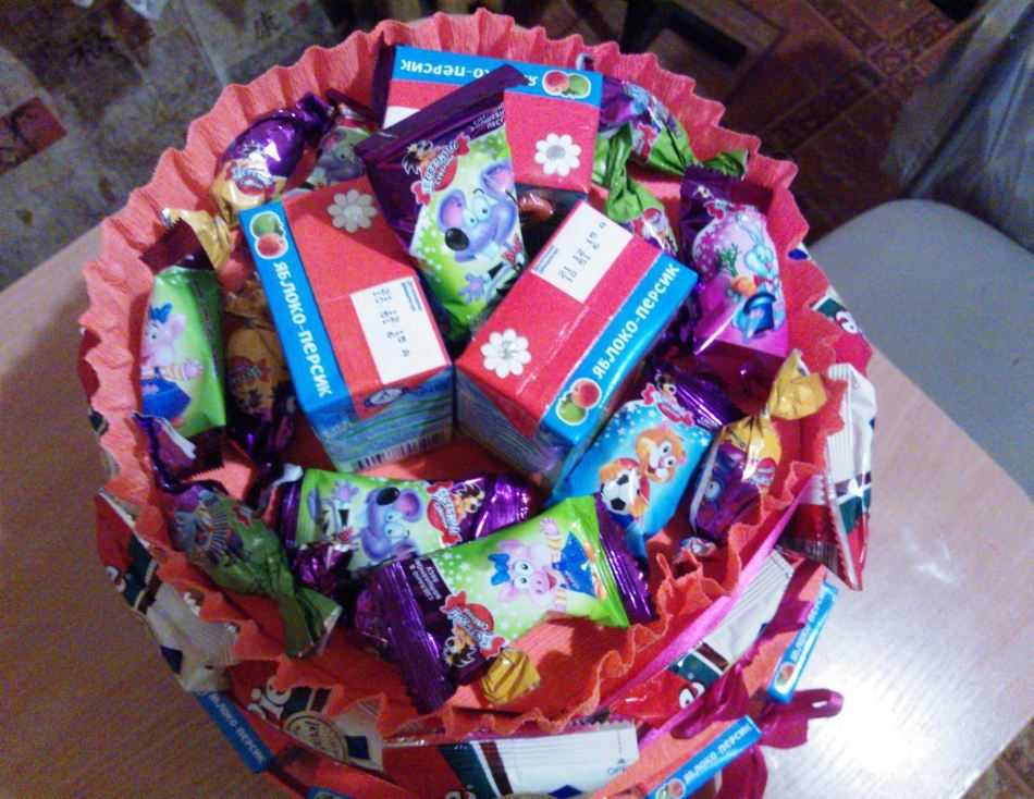 Угостить детей дома, в садике или школе ребенок сможет оригинальным тортиком из соков, конфет и сладких батончиков. Чтобы он у вас получился красивым, почитайте статьи: