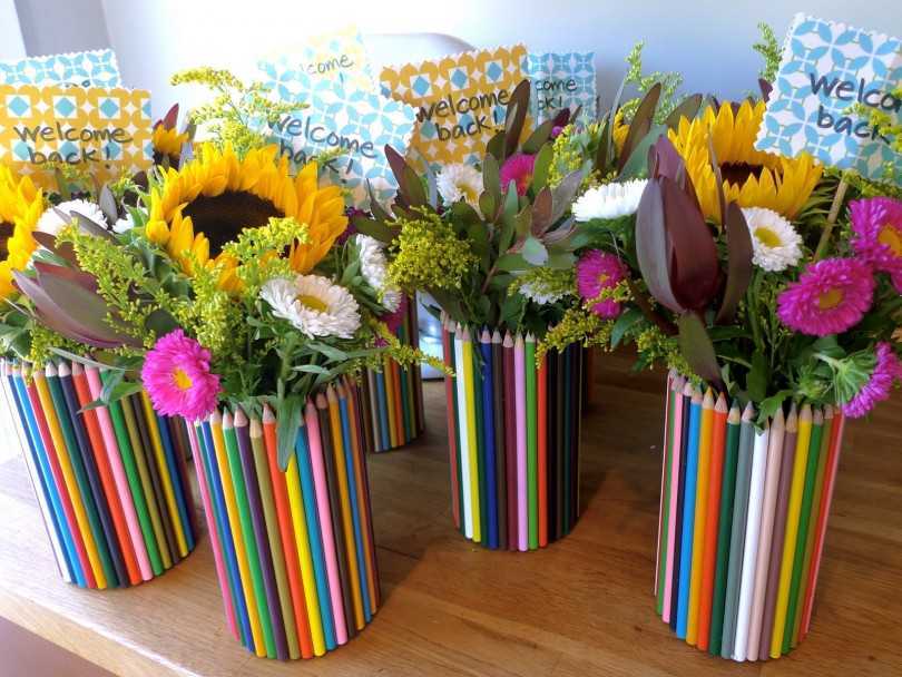 Основание письменных принадлежностей зафиксировать на губке, а всю композицию разместить в вазе. Необычный набор из ручек на День учителя – готов! Уверяем вас, от подобного гостинца не откажется ни один преподаватель!