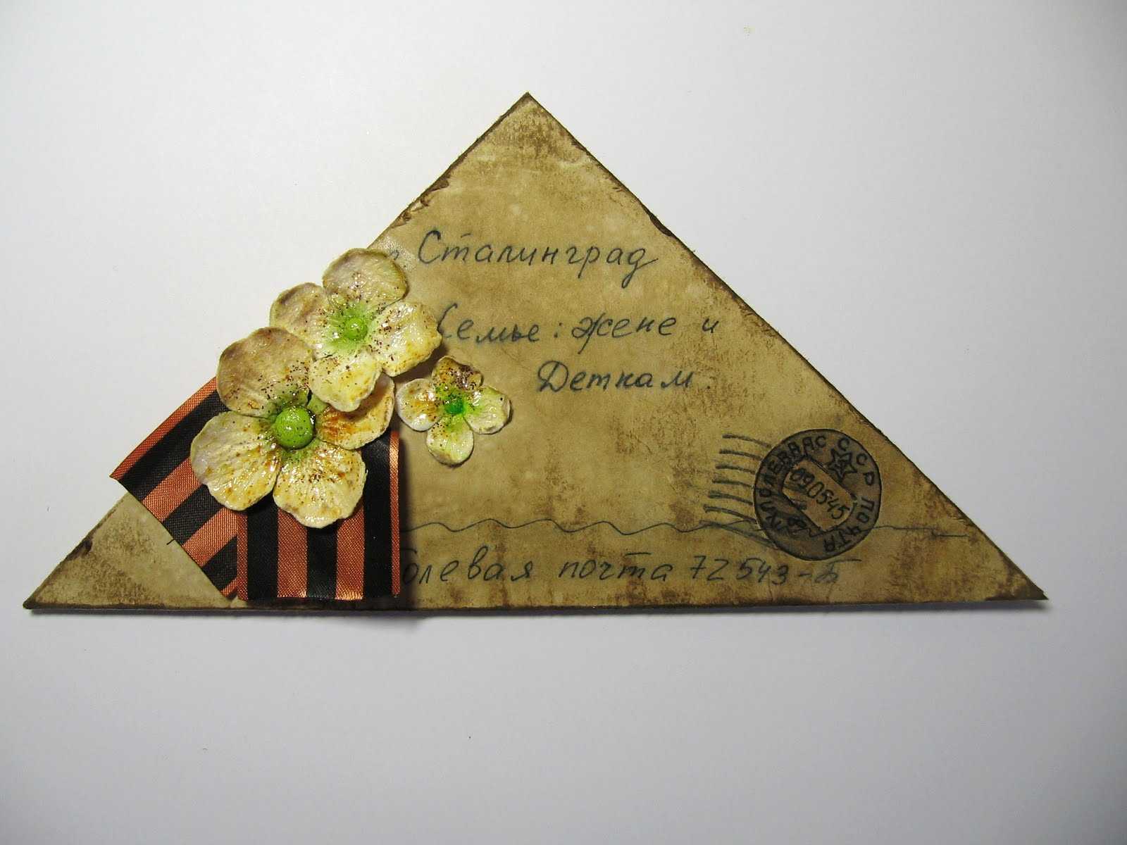 Поздравление к 9 Мая можно написать и сложить в форме открытки-треугольника, которое будет напоминать фронтовые письма.
